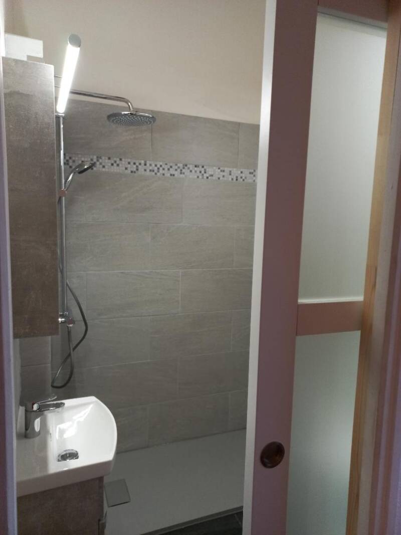 La salle de douche entièrement refaite à neuf tout récemment, lavec une douche à l'italienne, spacieuse et confortable. Lavabo et armoire de toilette.
