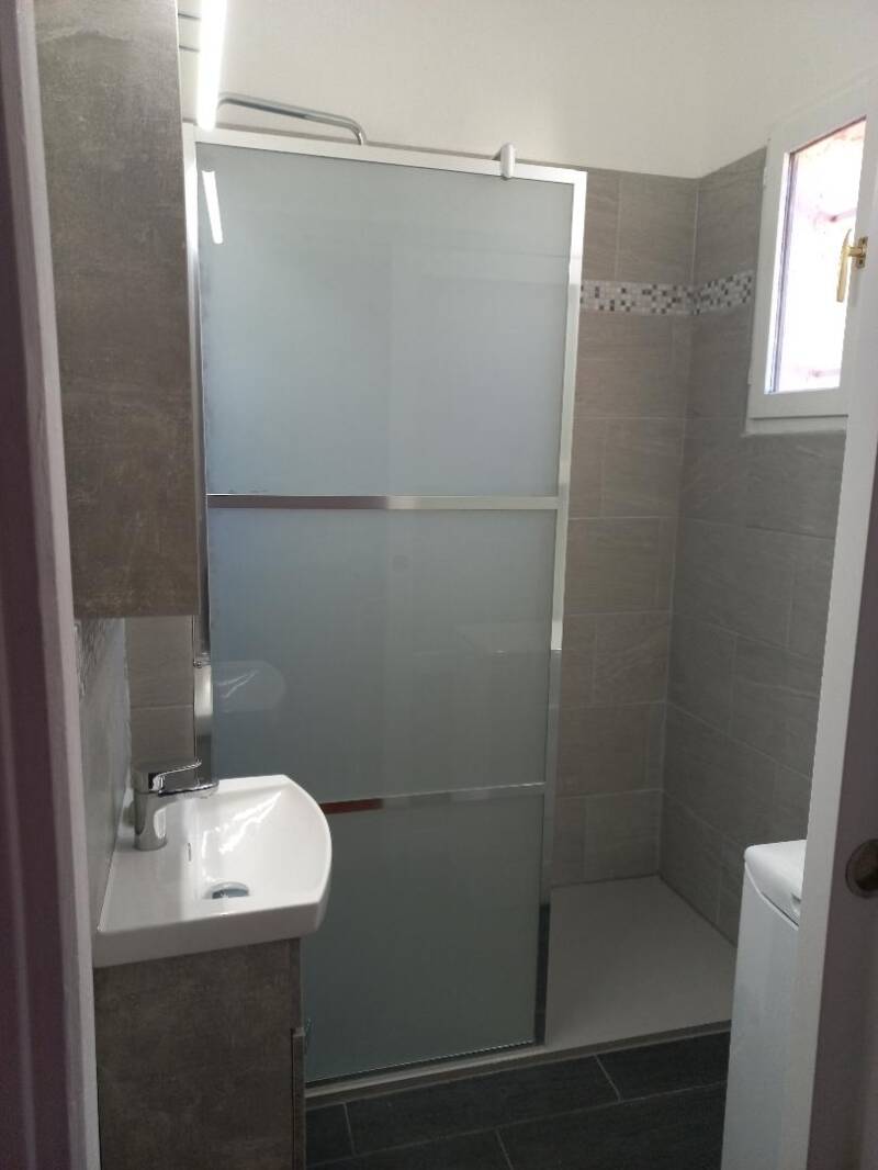 Un sèche serviettes électrique et un lave-linge apportent un confort agréable, la fenêtre permet d'aérer, la porte au vitrage dépoli donne de la lumière à la pièce